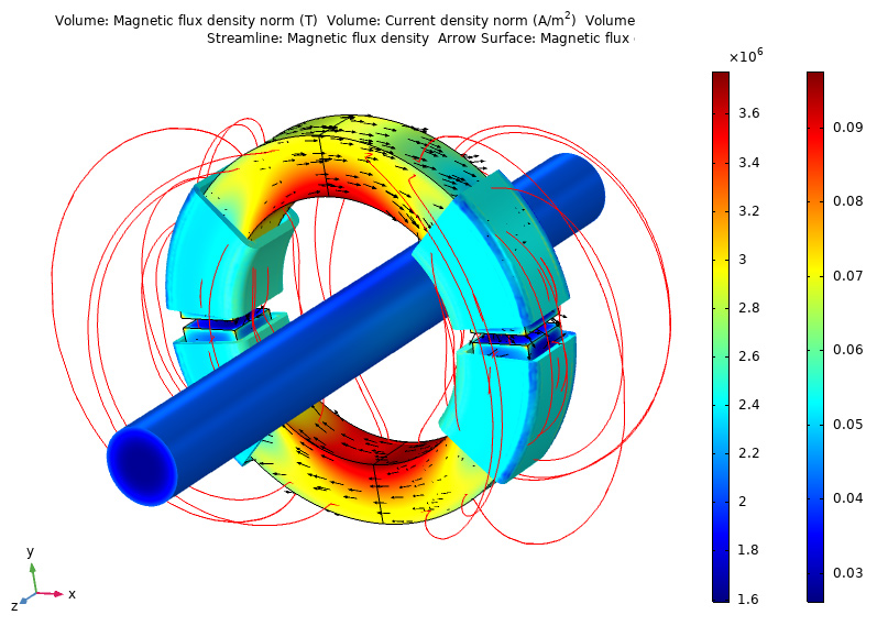 One time-consuming aspect of IT&S design is the conversion between a nonlinear magnetic B-H curve (DC magnetization) and equivalent AC effective H-B curve. ABB used an example application from the Application Library to perform these calculations. After finding the effective H-B curve with the application, they used the value to model the magnetic core of the split-core current sensor. They found that the magnetic permeability is almost linear throughout the entire core because of the decrease in magnetic flux density. Based on these results, the team concluded that homogenous anisotropic conductivity and permeability should be used.